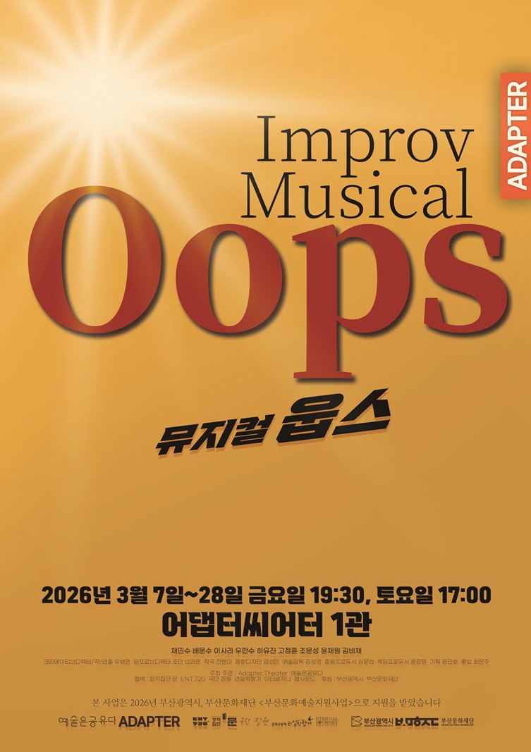 부산 광안리 어댑터씨어터에서 개최되는 임프로브 뮤지컬 웁스 Oops 공연은 기존의 정형화된 무대 문법을 파괴하며 관객과 배우가 실시간으로 서사를 구축하는 독창적인 예술 형식을 선보이고 있습니다. 예술은공유다 심문섭 대표가 기획한 이번 공연은 대본 없이 관객의 제안어로부터 시작되어 매회 세상에 단 하나뿐인 이야기와 음악을 탄생시키는 임프로브 뮤지컬의 진수를 보여줍니다.